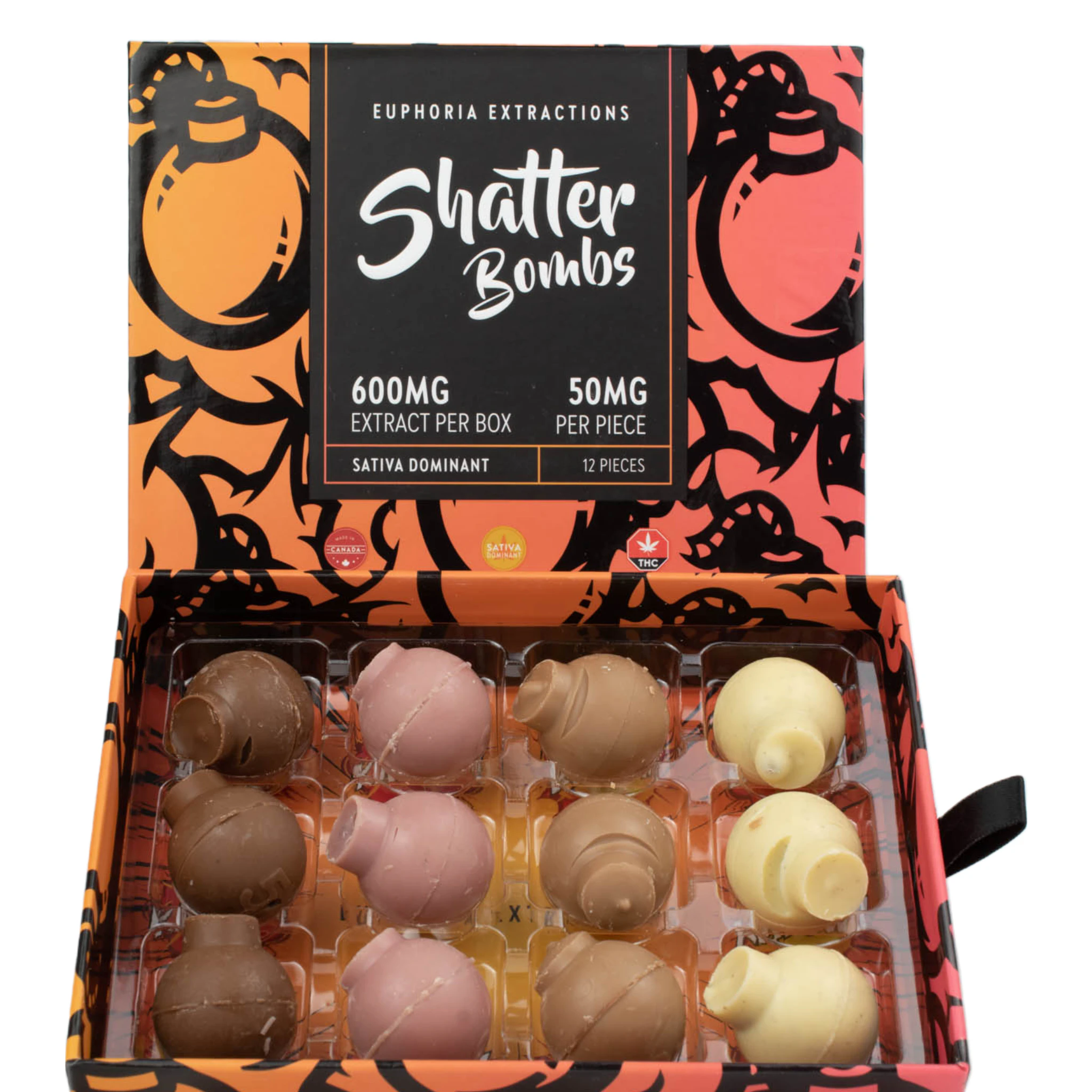 Introducing Euphoria Extracts' Sativa Shatter Bombs! These indulgent chocolate edibles pack a punch with a potent 600mg concentration of premium Sativa shatter. Experience the uplifting and energizing effects of Sativa cannabis wrapped in a delectable chocolate treat. Euphoria Extracts ensures the highest quality and precise dosing for a consistent and enjoyable experience. Get ready to elevate your mood and enhance your day with the Sativa Shatter Bombs from Euphoria Extracts. Indulge in the perfect fusion of flavor and potency.
